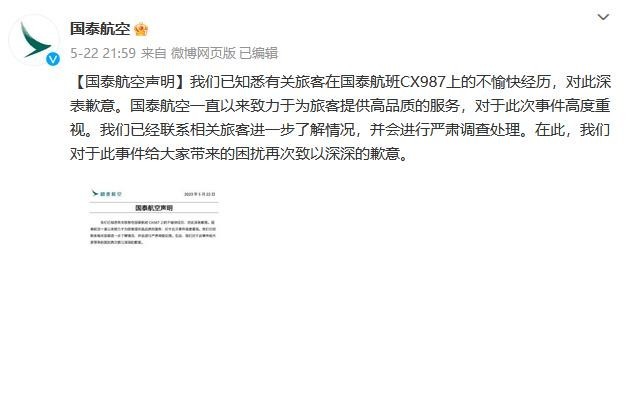 23日,國泰再次發(fā)聲明稱,已第一時(shí)間聯(lián)系旅客,目前已經(jīng)暫停有關(guān)乘務(wù)員的飛行任務(wù),即時(shí)展開內(nèi)部調(diào)查,并會(huì)于三日內(nèi)公布處理結(jié)果。