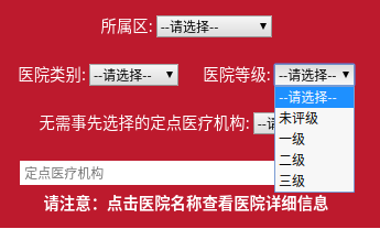 同時可選擇所屬區(qū)、醫(yī)院類別(定點中醫(yī)醫(yī)院、定點??漆t(yī)院、對外綜合等醫(yī)院等)、醫(yī)院等級,或輸入定點醫(yī)院名稱進行詳細查詢。