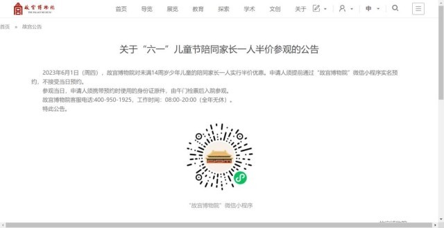 故宮:“六一”帶未滿14歲兒童參觀,一名家長半價