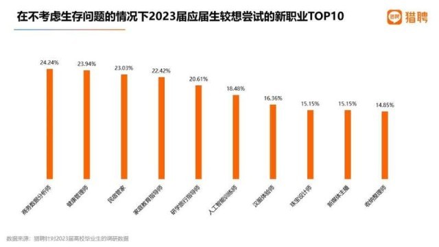 在求職偏好方面,調(diào)研顯示,超5成應(yīng)屆生首份工作期待月薪為5千-1萬(wàn)元,超6成期待三年后月薪1萬(wàn)-2萬(wàn)元。當(dāng)問(wèn)及應(yīng)屆生在不考慮生存問(wèn)題的情況下較想嘗試哪些新職業(yè)?答復(fù)中位居前五的是商務(wù)數(shù)據(jù)分析師、健康管理師、民宿管家、家庭教育指導(dǎo)師、研學(xué)旅行指導(dǎo)師,得票率均超20%。