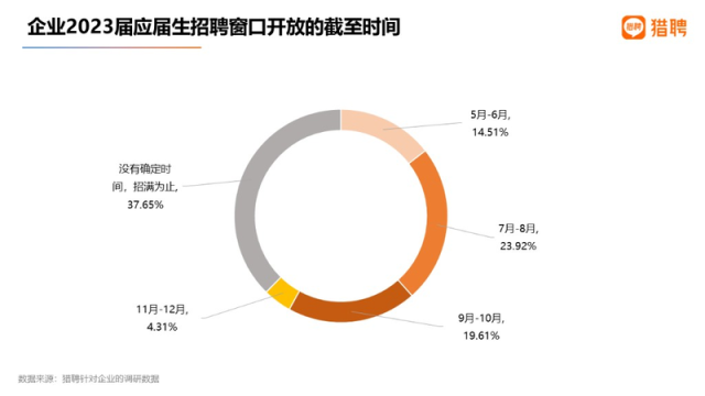 據(jù)了解,2023屆高校畢業(yè)生規(guī)模預(yù)計(jì)1158萬(wàn)人,同比增加82萬(wàn)人。本次調(diào)研中,有37.65%的企業(yè)表示校招窗口期“沒有確定截止時(shí)間,招滿為止”,23.92%的企業(yè)表示“最晚到7-8月”,19.61%的企業(yè)把期限定為9-10月。