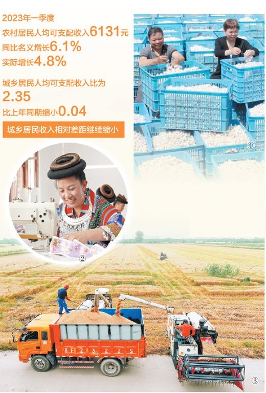國家統(tǒng)計局發(fā)布的數(shù)據(jù)顯示,去年農(nóng)村居民人均可支配收入首次邁上2萬元這個新臺階,城鄉(xiāng)居民收入相對差距持續(xù)縮小。今年一季度,農(nóng)村居民人均可支配收入繼續(xù)保持增長勢頭,同比名義增長6.1%,實際增長4.8%,比去年全年提高0.6個百分點。