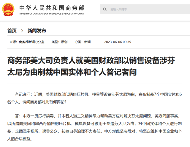 有記者問:近期,美國(guó)財(cái)政部以銷售壓片機(jī)、模具等設(shè)備涉芬太尼為由,宣布制裁7個(gè)中國(guó)實(shí)體和6名個(gè)人,請(qǐng)問商務(wù)部對(duì)此有何評(píng)論?