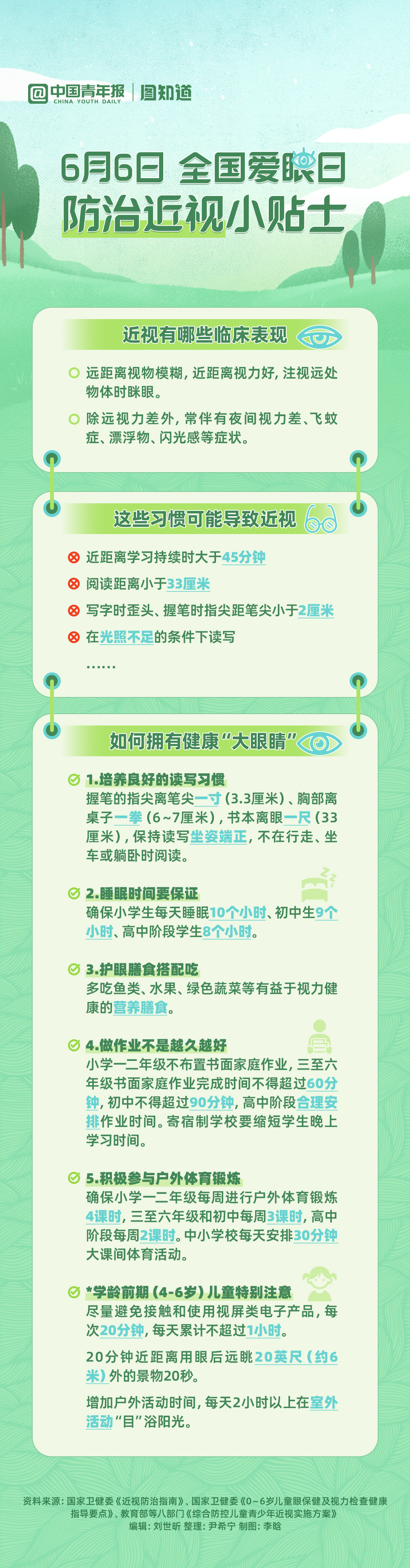 今年6月6日是第28個全國愛眼日。國家衛(wèi)健委數(shù)據(jù)顯示,2022年全國兒童青少年總體近視率為53.6%。你知道這些防治近視的小知識嗎:讀寫做到“一寸一拳一尺”;確保小學生每天睡眠10個小時;中小學校每天安排30分鐘大課間體育活動……轉給身邊的青少年朋友,一起守護健康“大眼睛”。