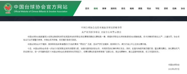 中國臺球協(xié)會:將從嚴處罰旅英涉賭球員 開展全行業(yè)警示教育