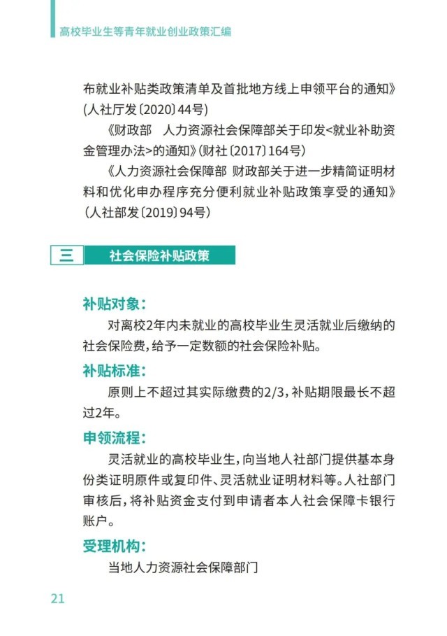 《匯編》系統(tǒng)梳理了國家有關(guān)部門出臺的促進高校畢業(yè)生就業(yè)創(chuàng)業(yè)現(xiàn)行政策,聚焦高校畢業(yè)生求職就業(yè)需求,分為企業(yè)就業(yè)、基層就業(yè)、自主創(chuàng)業(yè)、能力提升、應征入伍、就業(yè)見習、就業(yè)服務、就業(yè)手續(xù)、權(quán)益維護等九方面內(nèi)容。為便于高校畢業(yè)生和企業(yè)快速查閱相關(guān)政策,《匯編》還歸納整理了就業(yè)有關(guān)政策清單,包括6項面向企業(yè)(單位)吸納高校畢業(yè)生就業(yè)的補貼、稅收優(yōu)惠等政策,以及9項面向高校畢業(yè)生的補貼、資助等政策。