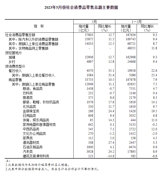 國家統(tǒng)計局公布數(shù)據(jù),5月份,社會消費品零售總額37803億元,同比增長12.7%。其中,除汽車以外的消費品零售額33875億元,增長11.5%。