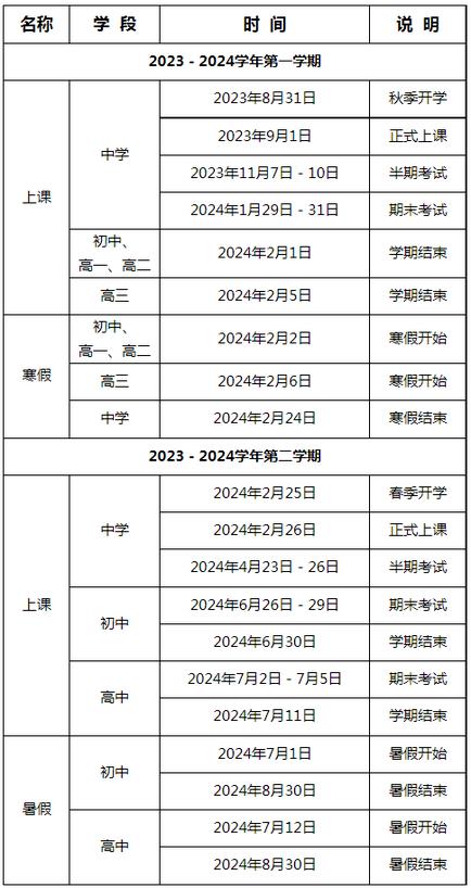 新學(xué)期開學(xué)時間:秋季學(xué)期,高三年級于2023年8月24日開學(xué);其他年級(含幼兒園)于8月31日報名,9月1日正式上課。