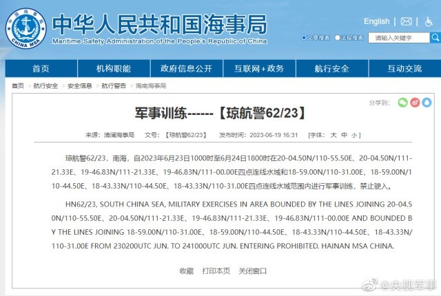 央視網(wǎng)消息:據(jù)中國(guó)海事局網(wǎng)站消息,清瀾海事局發(fā)布航行警告,6月23日10時(shí)至6月24日18時(shí),南海部分海域進(jìn)行軍事訓(xùn)練,禁止駛?cè)搿?/p>