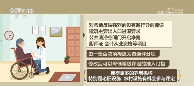 此次發(fā)布的指南包括環(huán)境、設(shè)施設(shè)備、運營管理、服務(wù)等多項內(nèi)容,與2020年發(fā)布的《<養(yǎng)老機構(gòu)等級劃分與評定>國家標(biāo)準(zhǔn)實施指南》(試行)相比,在框架、體例整體保持一致的前提下,刪除了一些可操作性不強以及非養(yǎng)老機構(gòu)必備的條件,對各地反映強烈的設(shè)有通行導(dǎo)向標(biāo)識、建筑主要出入口進深要求、公共洗浴空間門開啟凈寬、廚師證、會計從業(yè)資格等項目,由一票否決項降級為普通評分項,修改后可以降低等級評定的準(zhǔn)入門檻,使得更多的養(yǎng)老機構(gòu)特別是老舊設(shè)施、農(nóng)村設(shè)施有機會參與評定。