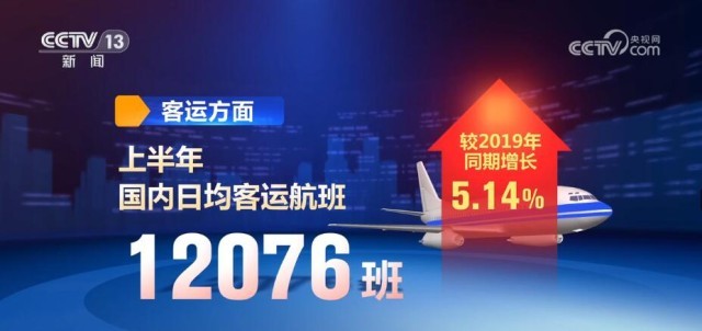 客運方面,上半年國內日均客運航班12076班,較2019年同期增長5.14%;國內日均旅客運輸量152.2萬人次,恢復至2019年同期的96.5%。貨運方面,上半年日均保障貨運航班590班,較2019年同期增長58.2%。