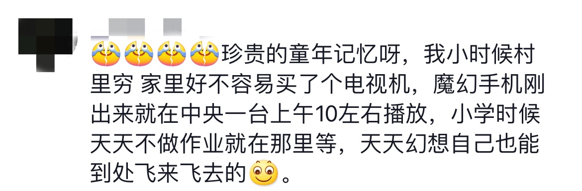 一名網(wǎng)友稱《魔幻手機》是自己珍貴的童年記憶,當(dāng)年家里好不容易買了電視機,小學(xué)時天天守在電視機前等待播出,“天天幻想自己也能到處飛來飛去”。