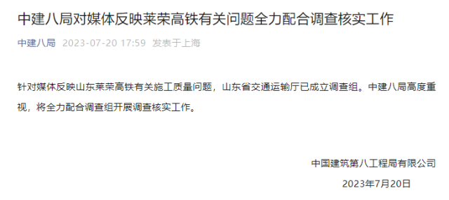 央視網(wǎng)消息:據(jù)“中建八局”公眾號消息,中國建筑第八工程局有限公司表示,針對媒體反映山東萊榮高鐵有關(guān)施工質(zhì)量問題,山東省交通運輸廳已成立調(diào)查組。中建八局高度重視,將全力配合調(diào)查組開展調(diào)查核實工作。