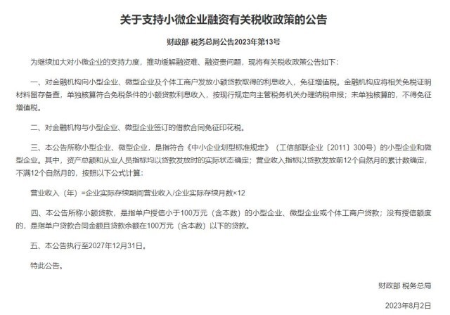 一、對金融機構(gòu)向小型企業(yè)、微型企業(yè)及個體工商戶發(fā)放小額貸款取得的利息收入,免征增值稅。金融機構(gòu)應(yīng)將相關(guān)免稅證明材料留存?zhèn)洳?,單獨核算符合免稅條件的小額貸款利息收入,按現(xiàn)行規(guī)定向主管稅務(wù)機關(guān)辦理納稅申報;未單獨核算的,不得免征增值稅。