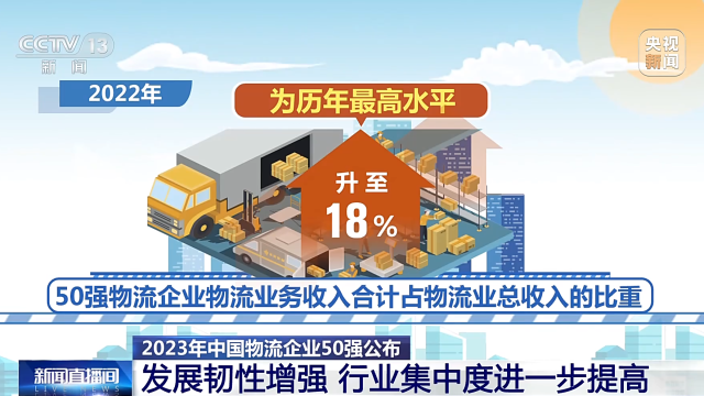 中國物流與采購聯(lián)合會今天發(fā)布了2023年度中國物流企業(yè)50強(qiáng)。從物流業(yè)務(wù)收入占比來看,50強(qiáng)物流企業(yè)的物流業(yè)務(wù)收入占物流業(yè)總收入的比重升至歷年最高,并且50強(qiáng)物流企業(yè)門檻大幅提高,顯示物流行業(yè)發(fā)展韌性較強(qiáng),行業(yè)集中度進(jìn)一步提高。
