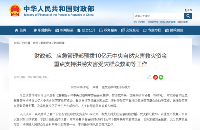為堅決貫徹落實習近平總書記重要指示和中央政治局常委會會議精神,按照黨中央、國務院決策部署,8月19日,財政部會同應急管理部再次預撥10億元中央自然災害救災資金,重點支持京津冀及黑龍江、吉林等受災嚴重地區(qū)做好受災群眾救助等工作,保障受災群眾得到妥善安置,及早恢復災區(qū)正常生產(chǎn)生活秩序,入冬前能夠回家或搬入新居。