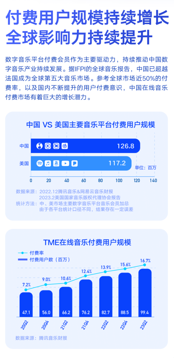 騰訊音樂一直致力于打造有吸引力的優(yōu)質(zhì)內(nèi)容、良好平臺(tái)生態(tài)、優(yōu)質(zhì)的付費(fèi)體驗(yàn),這些行動(dòng)都助推著用戶付費(fèi)意愿的釋放。例如,推出情侶會(huì)員包、臻品音質(zhì)音效等系列產(chǎn)品;音樂服務(wù)使用場(chǎng)景拓展,包括多種IoT設(shè)備;通過AIGC創(chuàng)新應(yīng)用,為用戶提供高度個(gè)性化、差異化的音樂娛樂體驗(yàn);搭建“Next Singer2023”全國(guó)校園音樂大賽、“浪潮制造者”和“巔峰音樂節(jié)”等豐富的音樂IP矩陣,吸引廣泛而多樣化的受眾;同時(shí),TME不斷深化與知名唱片和藝人的戰(zhàn)略合作,持續(xù)培養(yǎng)、扶持潛力音樂人的音樂創(chuàng)作能力,使TME的行業(yè)影響力、內(nèi)容吸引力的進(jìn)一步增強(qiáng),為平臺(tái)注入活力,進(jìn)而更好地滿足用戶的音樂需求。