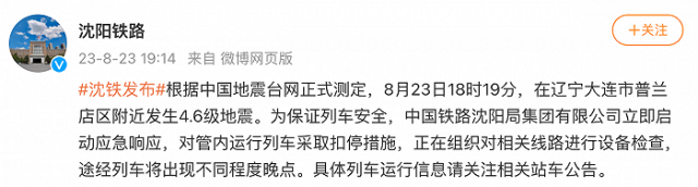 央視網(wǎng)消息:據(jù)@沈陽(yáng)鐵路 微博消息,根據(jù)中國(guó)地震臺(tái)網(wǎng)正式測(cè)定,8月23日18時(shí)19分,在遼寧大連市普蘭店區(qū)附近發(fā)生4.6級(jí)地震。為保證列車安全,中國(guó)鐵路沈陽(yáng)局集團(tuán)有限公司立即啟動(dòng)應(yīng)急響應(yīng),對(duì)管內(nèi)運(yùn)行列車采取扣停措施,正在組織對(duì)相關(guān)線路進(jìn)行設(shè)備檢查,途經(jīng)列車將出現(xiàn)不同程度晚點(diǎn)。具體列車運(yùn)行信息請(qǐng)關(guān)注相關(guān)站車公告。