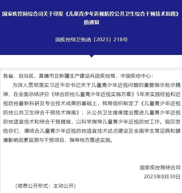 國家疾控局印發(fā)《兒童青少年近視防控公共衛(wèi)生綜合干預(yù)技術(shù)指南》