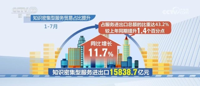 知識(shí)密集型服務(wù)貿(mào)易占比提升。1月—7月,知識(shí)密集型服務(wù)進(jìn)出口15838.7億元,同比增長11.7%,占服務(wù)進(jìn)出口總額的比重達(dá)43.2%,較上年同期提升1.4個(gè)百分點(diǎn)。