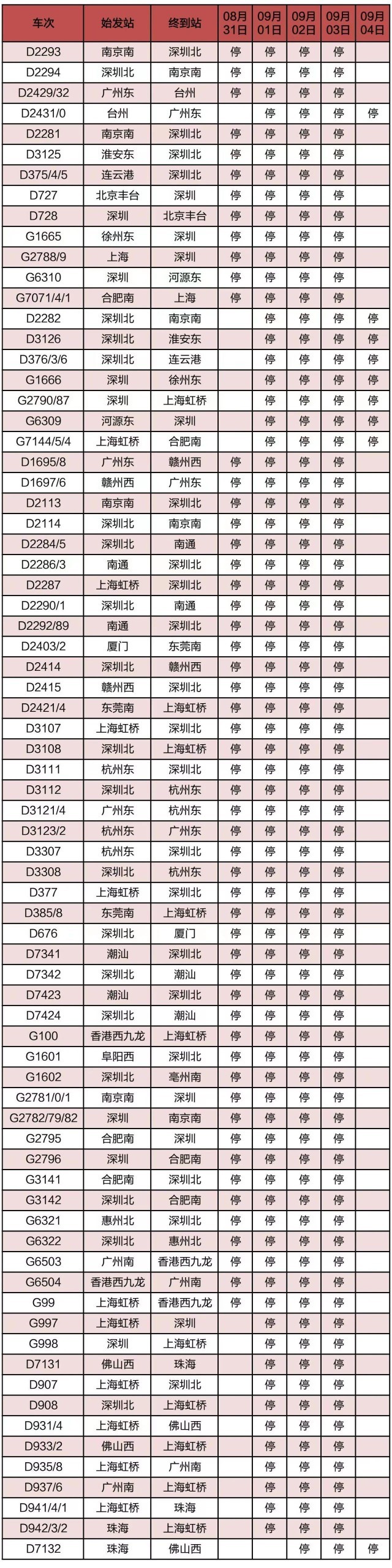 “長(zhǎng)三角鐵路”消息:受第9號(hào)臺(tái)風(fēng)“蘇拉”影響,為確保列車運(yùn)行安全,鐵路部門計(jì)劃對(duì)杭深線、京港高鐵、廣深城際、廣深港高鐵、穗深城際、京九線等線路運(yùn)行的部分列車采取停運(yùn)措施,計(jì)劃停運(yùn)8月31日至9月6日間共121趟旅客列車:其中停運(yùn)動(dòng)車組列車74趟,停運(yùn)普速列車47趟。(停運(yùn)列車車次信息見(jiàn)附表)