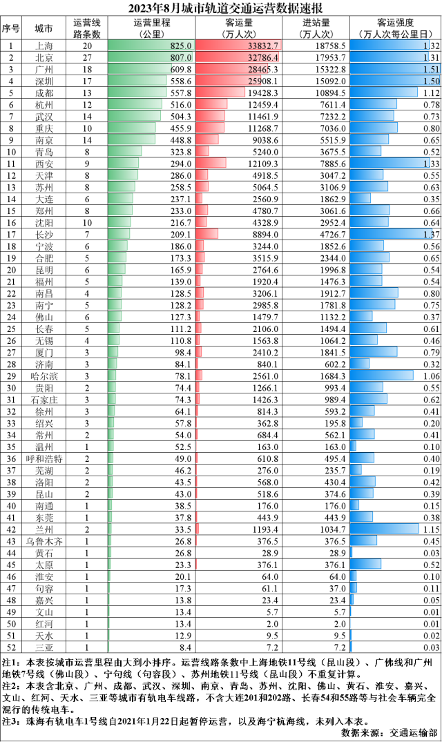 央視網(wǎng)消息:交通運(yùn)輸部發(fā)布2023年8月城市軌道交通運(yùn)營(yíng)數(shù)據(jù)速報(bào),2023年8月,31個(gè)?。ㄗ灾螀^(qū)、直轄市)和新疆生產(chǎn)建設(shè)兵團(tuán)共有54個(gè)城市開(kāi)通運(yùn)營(yíng)城市軌道交通線路297條,運(yùn)營(yíng)里程9771.8公里,實(shí)際開(kāi)行列車325萬(wàn)列次,完成客運(yùn)量27.1億人次,進(jìn)站量16.3億人次。8月份,客運(yùn)量環(huán)比增加0.4億人次、增長(zhǎng)1.7%,同比增加7.5億人次、增長(zhǎng)38.4%,較2019年月均客運(yùn)量增加7.2億人次、增長(zhǎng)36.0%。8月份客運(yùn)強(qiáng)度平均水平為0.556萬(wàn)人次每公里日,較2019年全年客運(yùn)強(qiáng)度平均水平增長(zhǎng)1.9%。