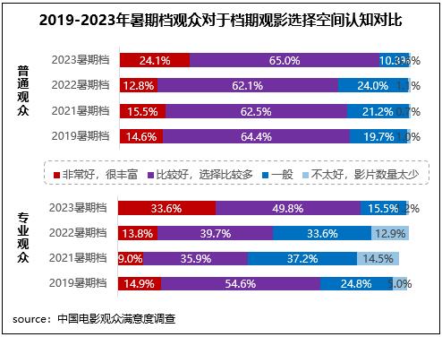2023年7-8月新上映影片共80部,為近四年來(lái)同期最高值,滿意度調(diào)查的13部影片涵蓋劇情、動(dòng)畫、奇幻、懸疑、愛(ài)情、喜劇、動(dòng)作等多元類型,給觀眾帶來(lái)多樣化的觀影選擇。調(diào)研數(shù)據(jù)顯示,不同觀眾對(duì)于檔期觀影選擇空間均給予了好評(píng),普通觀眾、專業(yè)觀眾認(rèn)為檔期觀影選擇“非常好,很豐富”和“比較好,選擇比較多”的占比合計(jì)分別達(dá)89.2%、83.4%,均為近五年同期最高。