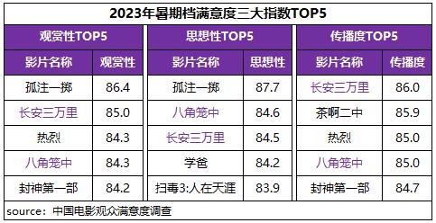 中國(guó)電影觀眾滿意度調(diào)查 2023年暑期檔調(diào)查結(jié)果顯示,暑期檔電影觀眾滿意度得分84.5分,較“五一”檔增長(zhǎng)1.2分。檔期豐富多元的影片內(nèi)容得到了觀眾的高滿意度評(píng)價(jià),調(diào)查的13部影片悉數(shù)進(jìn)入“滿意”區(qū)間(≥80分),有6部影片滿意度超84分,數(shù)量及占比居歷年同期之最。其中《孤注一擲》《長(zhǎng)安三萬(wàn)里》分別以86.4分、85.1分為檔期滿意度單片冠亞軍,《八角籠中》《茶啊二中》《熱烈》和《封神第一部》四部影片滿意度均超84分。2023年暑期檔高滿意度佳作迭出,市場(chǎng)驚喜不斷,觀影氛圍持續(xù)火熱。
