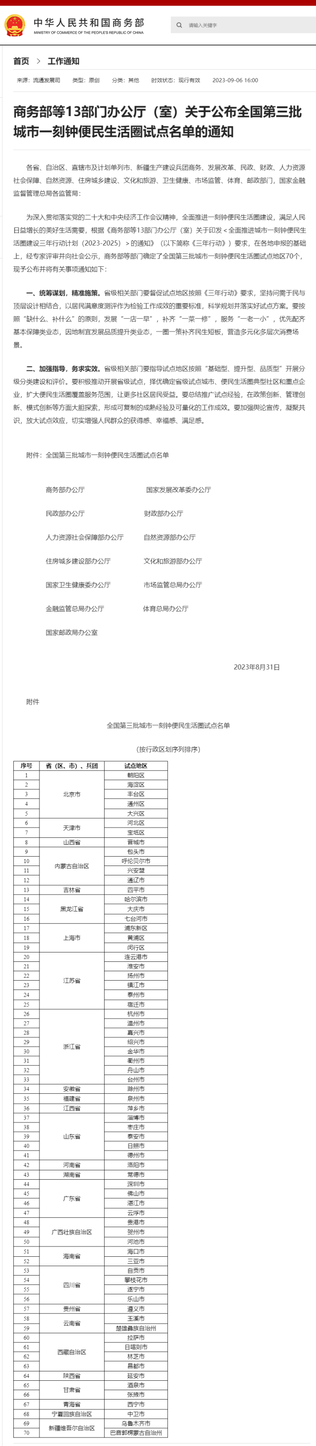 為深入貫徹落實(shí)黨的二十大和中央經(jīng)濟(jì)工作會議精神,全面推進(jìn)一刻鐘便民生活圈建設(shè),滿足人民日益增長的美好生活需要,根據(jù)《商務(wù)部等13部門辦公廳(室)關(guān)于印發(fā)<全面推進(jìn)城市一刻鐘便民生活圈建設(shè)三年行動計(jì)劃(2023-2025)>的通知》(以下簡稱《三年行動》)要求,在各地申報的基礎(chǔ)上,經(jīng)專家評審并向社會公示,商務(wù)部等部門確定了全國第三批城市一刻鐘便民生活圈試點(diǎn)地區(qū)70個,現(xiàn)予公布并將有關(guān)事項(xiàng)通知如下: