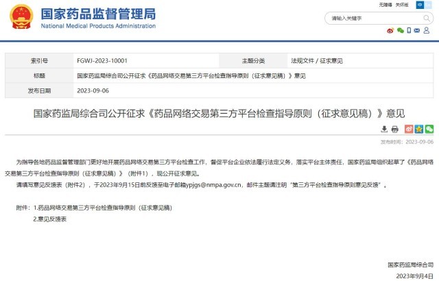 國(guó)家藥監(jiān)局就《藥品網(wǎng)絡(luò)交易第三方平臺(tái)檢查指導(dǎo)原則(征求意見(jiàn)稿)》公開(kāi)征求意見(jiàn)