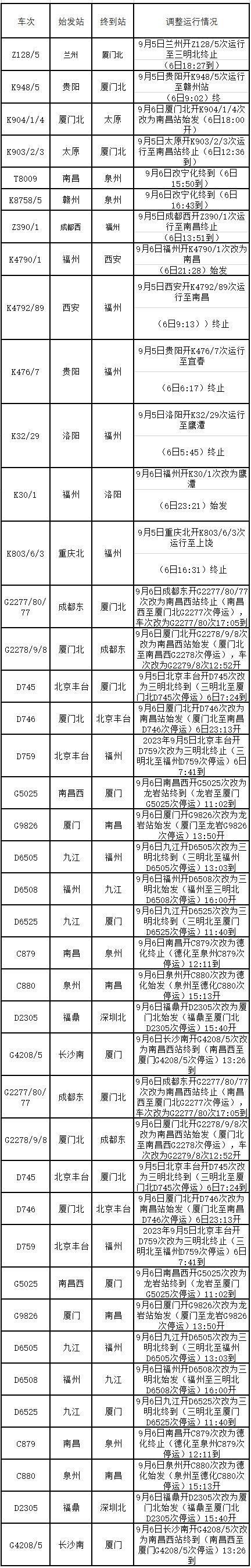 受臺風(fēng)“??睔堄喹h(huán)流影響,預(yù)計9月6日8時至7日8時,福建東部和南部、江西南部等地有大到暴雨,其中福建東南部沿海部分地區(qū)有大暴雨,局地有雷暴大風(fēng)等強對流天氣。為確保人民生命財產(chǎn)安全和鐵路運輸安全,中國鐵路南昌局集團有限公司(以下簡稱南鐵)調(diào)整9月6日、7日部分旅客列車運行方案(具體見附件)。