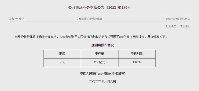 央視網(wǎng)消息:據(jù)央行網(wǎng)站消息,2023年9月6日人民銀行以利率招標(biāo)方式開(kāi)展了260億元逆回購(gòu)操作。