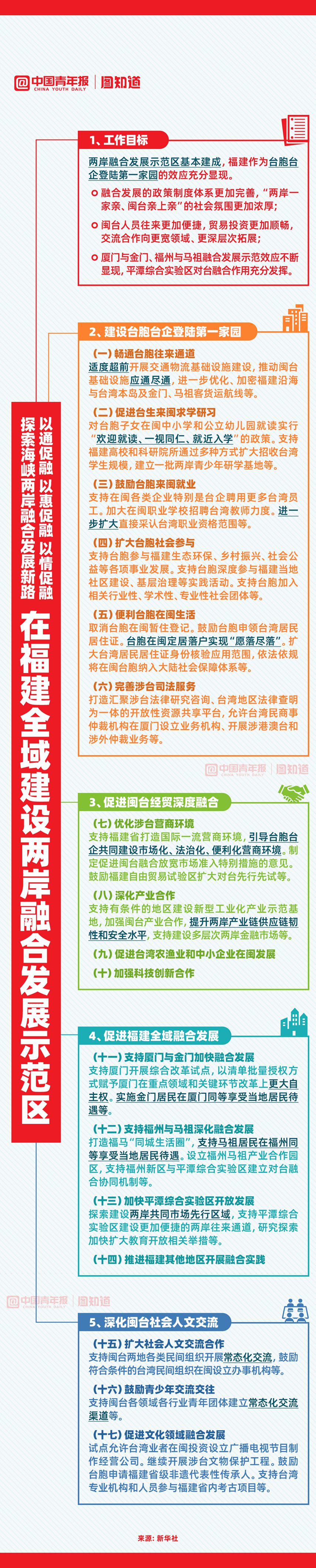 為深化兩岸各領(lǐng)域融合發(fā)展,推進(jìn)祖國(guó)和平統(tǒng)一進(jìn)程,中共中央、國(guó)務(wù)院近日印發(fā)《關(guān)于支持福建探索海峽兩岸融合發(fā)展新路 建設(shè)兩岸融合發(fā)展示范區(qū)的意見(jiàn)》,以通促融、以惠促融、以情促融,有哪些最新措施,一圖了解收藏。
