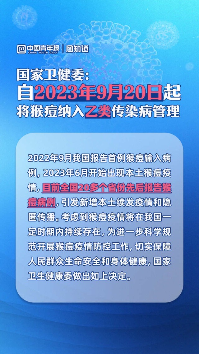 今年以來,我國(guó)已有20多個(gè)省份先后報(bào)告猴痘病例,引發(fā)新增本土續(xù)發(fā)疫情和隱匿傳播。國(guó)家衛(wèi)健委9月15日發(fā)布公告稱,自2023年9月20日起將猴痘納入乙類傳染病進(jìn)行管理,采取乙類傳染病的預(yù)防、控制措施。