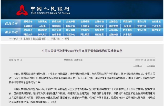 央視網(wǎng)消息:中國人民銀行9月14日公告,決定于2023年9月15日下調(diào)金融機構(gòu)存款準(zhǔn)備金率0.25個百分點(不含已執(zhí)行5%存款準(zhǔn)備金率的金融機構(gòu))。本次下調(diào)后,金融機構(gòu)加權(quán)平均存款準(zhǔn)備金率約為7.4%。