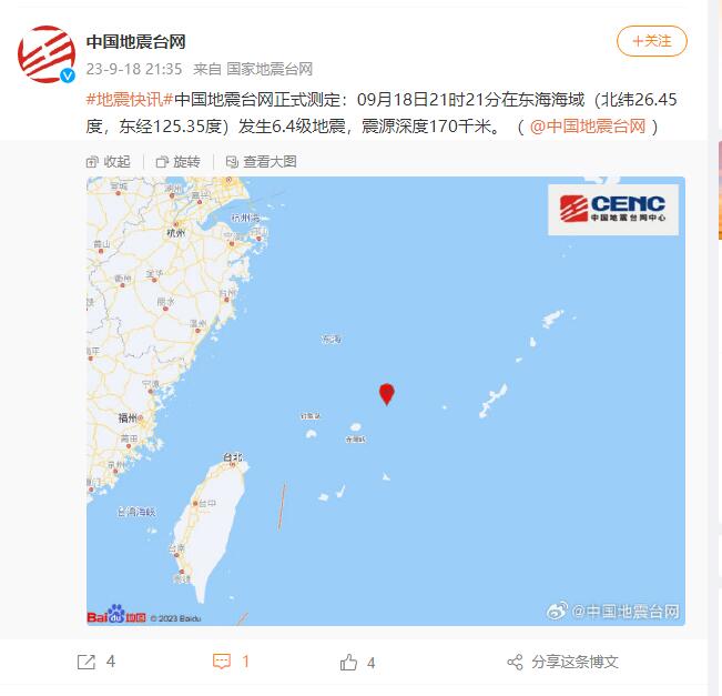 中國地震臺(tái)網(wǎng)正式測定:09月18日21時(shí)21分在東海海域(北緯26.45度,東經(jīng)125.35度)發(fā)生6.4級(jí)地震,震源深度170千米。