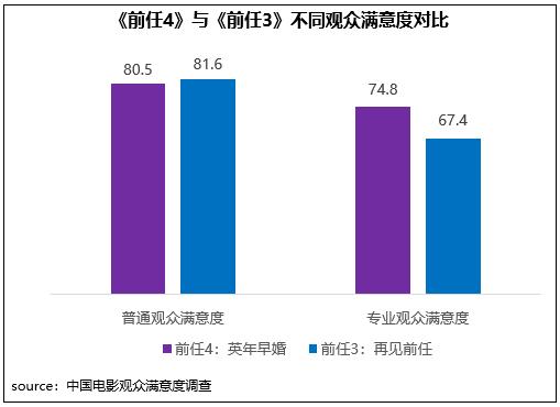 《前任4:英年早婚》在同系列影片輕松、寫實創(chuàng)作風(fēng)格基礎(chǔ)上,進階到婚姻話題探討,并進一步強化對觀眾現(xiàn)實情感生活的細(xì)致洞察,成為當(dāng)代人的愛情圖鑒。在不同觀眾評價中,影片相對更受專業(yè)觀眾的青睞,專業(yè)觀眾滿意度得分74.8分,高于上一部作品7.4分,其中精彩對白、傳播方式得分居檔期第二和第三位;但普通觀眾對其評價一般,滿意度得分80.5分,比上一部低1.1分。