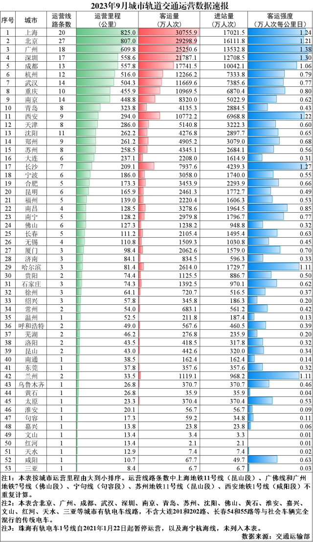 2023年9月,31個(gè)省(自治區(qū)、直轄市)和新疆生產(chǎn)建設(shè)兵團(tuán)共有55個(gè)城市開(kāi)通運(yùn)營(yíng)城市軌道交通線(xiàn)路299條,運(yùn)營(yíng)里程9859.5公里,實(shí)際開(kāi)行列車(chē)318萬(wàn)列次,完成客運(yùn)量24.9億人次,進(jìn)站量14.9億人次。9月份,客運(yùn)量環(huán)比減少2.2億人次、降低8.2%,同比增加7.1億人次、增長(zhǎng)40%,較2019年月均客運(yùn)量增加5億人次、增長(zhǎng)24.9%。9月份客運(yùn)強(qiáng)度平均水平為0.536萬(wàn)人次每公里日,較2019年全年客運(yùn)強(qiáng)度平均水平降低1.8%。