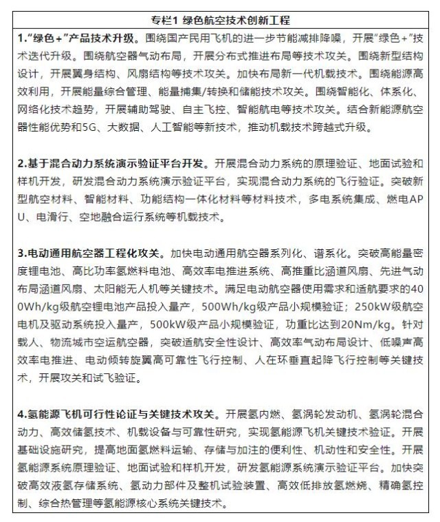 1.強(qiáng)化綠色航空關(guān)鍵核心技術(shù)攻關(guān)。持續(xù)推動總體、氣動、結(jié)構(gòu)、發(fā)動機(jī)、機(jī)載、材料、制造工藝等領(lǐng)域技術(shù)升級換代,加速發(fā)展混合動力推進(jìn)系統(tǒng),不斷提升干支線飛機(jī)、通用航空器節(jié)能減排降噪水平。加快發(fā)展高能量密度、高放電效率、高安全性的航空動力電池技術(shù),以及高可靠性、高功重比、高效率的航空電推進(jìn)技術(shù)。加強(qiáng)高效燃?xì)鉁u輪-電能融合技術(shù)研究。引導(dǎo)優(yōu)勢企業(yè)和研究機(jī)構(gòu)持續(xù)突破智能化、高可靠性、輕量化、低成本能量控制和飛行控制技術(shù),開展新能源飛機(jī)總體設(shè)計、能源系統(tǒng)設(shè)計、全電機(jī)載系統(tǒng)等技術(shù)攻關(guān)。持續(xù)探索氫燃料存儲技術(shù)、氫燃料電池技術(shù)、氫內(nèi)燃、氫渦輪發(fā)動機(jī)技術(shù)、氫渦輪混合電推進(jìn)技術(shù)、能量綜合管理技術(shù)等氫能源飛機(jī)關(guān)鍵技術(shù)。面向國家綠色航空發(fā)展的戰(zhàn)略需要,加快布局基礎(chǔ)研究和應(yīng)用基礎(chǔ)研究,解決制約綠色航空發(fā)展的源頭和底層技術(shù)問題。