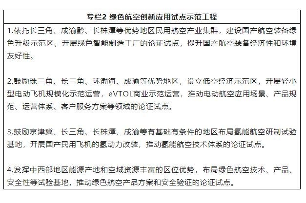 7.推動新能源航空器區(qū)域應(yīng)用試點(diǎn)示范。依托優(yōu)勢地區(qū),建設(shè)國產(chǎn)航空裝備綠色升級示范區(qū)。鼓勵各地區(qū)結(jié)合區(qū)域經(jīng)濟(jì)發(fā)展基礎(chǔ)和需求,開展電動通航飛機(jī)、eVTOL試點(diǎn)示范應(yīng)用,探索技術(shù)和裝備體系、應(yīng)用場景、商業(yè)運(yùn)營新模式。鼓勵有基礎(chǔ)有條件的地區(qū)布局綠色航空關(guān)鍵技術(shù)、產(chǎn)品方案、安全驗證等試驗基地。