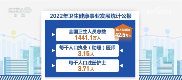 《公報》顯示,我國醫(yī)療衛(wèi)生資源總量繼續(xù)增加。到2022年末,全國醫(yī)療衛(wèi)生機(jī)構(gòu)達(dá)到1032918個,比上年增加1983個。全國共設(shè)置13個類別的國家醫(yī)學(xué)中心和兒童類別的國家區(qū)域醫(yī)療中心。全國醫(yī)療衛(wèi)生機(jī)構(gòu)床位975.0萬張,每千人口醫(yī)療衛(wèi)生機(jī)構(gòu)床位數(shù)由2021年的6.70張增加到2022年的6.92張。全國衛(wèi)生人員總數(shù)1441.1萬人,比上年增加42.5萬人。每千人口執(zhí)業(yè)(助理)醫(yī)師3.15人,每千人口注冊護(hù)士3.71人。