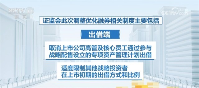 證監(jiān)會此次調(diào)整優(yōu)化融券相關(guān)制度主要包括:融券端,將融券保證金比例由不得低于50%上調(diào)至80%,對私募證券投資基金參與融券的保證金比例上調(diào)至100%;出借端,取消上市公司高管及核心員工通過參與戰(zhàn)略配售設立的專項資產(chǎn)管理計劃出借,適度限制其他戰(zhàn)略投資者在上市初期的出借方式和比例。