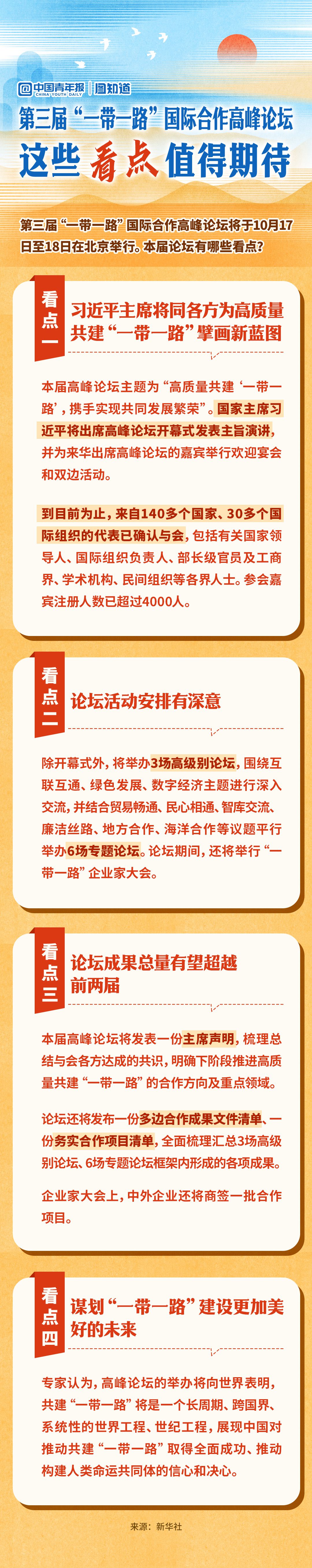 第三屆“一帶一路”國際合作高峰論壇將于10月17日至18日在北京舉行。本屆論壇有哪些看點(diǎn)?一圖查看,共同期待論壇的豐厚成果!
