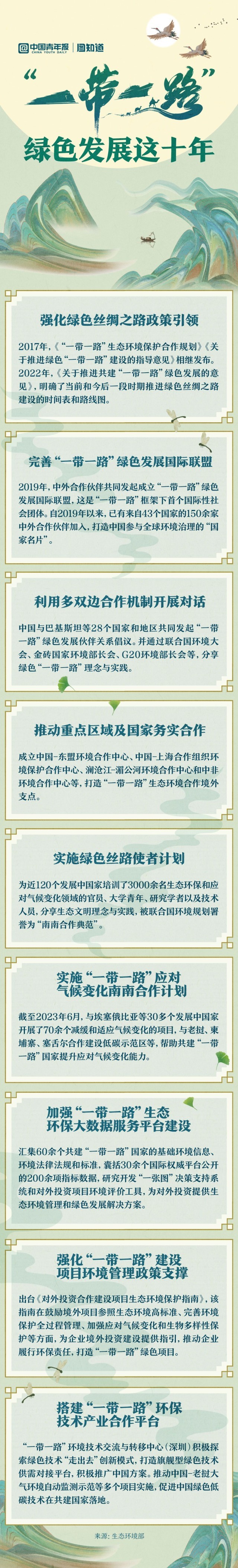 綠色已成為共建“一帶一路”鮮明底色。十年來(lái),綠色絲綢之路建設(shè)為全球環(huán)境與氣候治理不斷貢獻(xiàn)力量。中國(guó)實(shí)施的綠色絲路使者計(jì)劃為近120個(gè)發(fā)展中國(guó)家培訓(xùn)了3000余名生態(tài)環(huán)保和應(yīng)對(duì)氣候變化領(lǐng)域的大學(xué)青年、技術(shù)人員等,許多年輕人成為綠色絲路使者,為共建“一帶一路”國(guó)家落實(shí)聯(lián)合國(guó)2030年可持續(xù)發(fā)展議程提供方案,接力下一個(gè)十年。