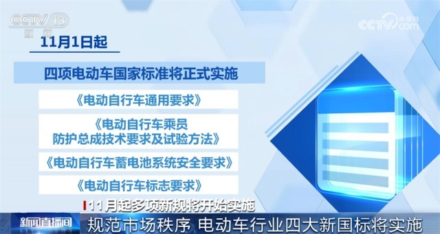 11月1日起,四項(xiàng)電動車國家標(biāo)準(zhǔn)將正式實(shí)施,分別是《電動自行車通用要求》《電動自行車乘員防護(hù)總成技術(shù)要求及試驗(yàn)方法》《電動自行車蓄電池系統(tǒng)安全要求》以及《電動自行車標(biāo)志要求》。這些標(biāo)準(zhǔn)對電動車的設(shè)計(jì)制造、安全性能、電池系統(tǒng)和標(biāo)識等方面都提出了明確規(guī)定,涉及電動車的車把、鋰電池、總線設(shè)計(jì)、電子控制系統(tǒng)等。