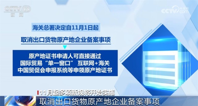 海關(guān)總署決定自11月1日起,取消出口貨物原產(chǎn)地企業(yè)備案事項(xiàng),原產(chǎn)地證書申請人可直接通過國際貿(mào)易“單一窗口”“互聯(lián)網(wǎng)+海關(guān)”、中國貿(mào)促會申報(bào)系統(tǒng)等申領(lǐng)原產(chǎn)地證書,進(jìn)一步優(yōu)化跨境貿(mào)易營商環(huán)境,提升貿(mào)易便利。