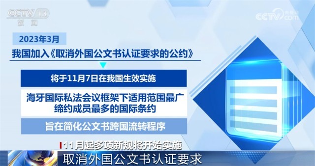 今年3月,我國加入《取消外國公文書認(rèn)證要求的公約》,《公約》將于11月7日在我國生效實(shí)施。《公約》是海牙國際私法會議框架下適用范圍最廣、締約成員最多的國際條約,旨在簡化公文書跨國流轉(zhuǎn)程序。11月7日起,中國送往其他締約國使用的公文書僅需辦理《公約》規(guī)定的附加證明書,即可送其他締約國使用,無需辦理中國和締約國駐華使領(lǐng)館的領(lǐng)事認(rèn)證。其他締約國公文書送中國內(nèi)地使用,只需辦理該國附加證明書,無需辦理該國和中國駐當(dāng)?shù)厥诡I(lǐng)館的領(lǐng)事認(rèn)證。
