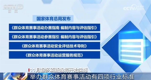 國家體育總局發(fā)布的《群眾體育賽事活動辦賽指南 編制內(nèi)容與評估指引》《群眾體育賽事活動參賽指引 編制內(nèi)容與評估指引》《群眾體育賽事活動安全評估技術(shù)導(dǎo)則》《群眾體育賽事活動運(yùn)營服務(wù)規(guī)范》四項(xiàng)體育行業(yè)標(biāo)準(zhǔn)自11月1日起實(shí)施。這些標(biāo)準(zhǔn)明確了群眾體育賽事活動安全評估的流程、策劃、實(shí)施和總結(jié),運(yùn)營服務(wù)的基本要求、服務(wù)要求、管理要求等內(nèi)容,適用于各級各類群眾體育賽事活動的舉辦。