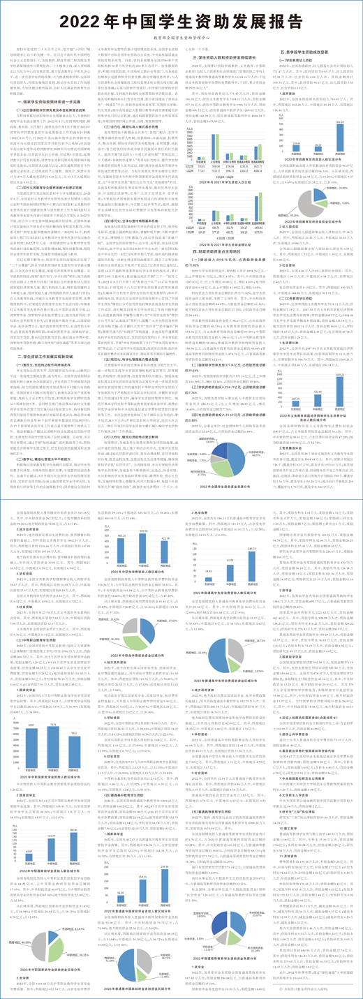 2022年是黨的二十大召開之年,是實施“十四五”規(guī)劃綱要承上啟下的關鍵一年。在習近平新時代中國特色社會主義思想指引下,各級教育、財政等部門和各級各類學校緊緊圍繞學習貫徹黨的二十大精神主線,深入貫徹落實以人民為中心的發(fā)展思想,著力促進教育公平和社會公平,進一步完善學生資助政策,大力推進精準資助,全面深化資助育人,持續(xù)加強規(guī)范管理,推動學生資助工作高質量發(fā)展,為加快建設教育強國、辦好人民滿意的教育作出積極貢獻。