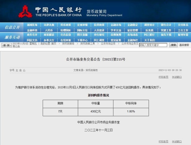 據(jù)央行官網(wǎng)消息,為維護銀行體系流動性合理充裕,2023年11月3日中國人民銀行以利率招標(biāo)方式開展了430億元逆回購操作。具體情況如下: